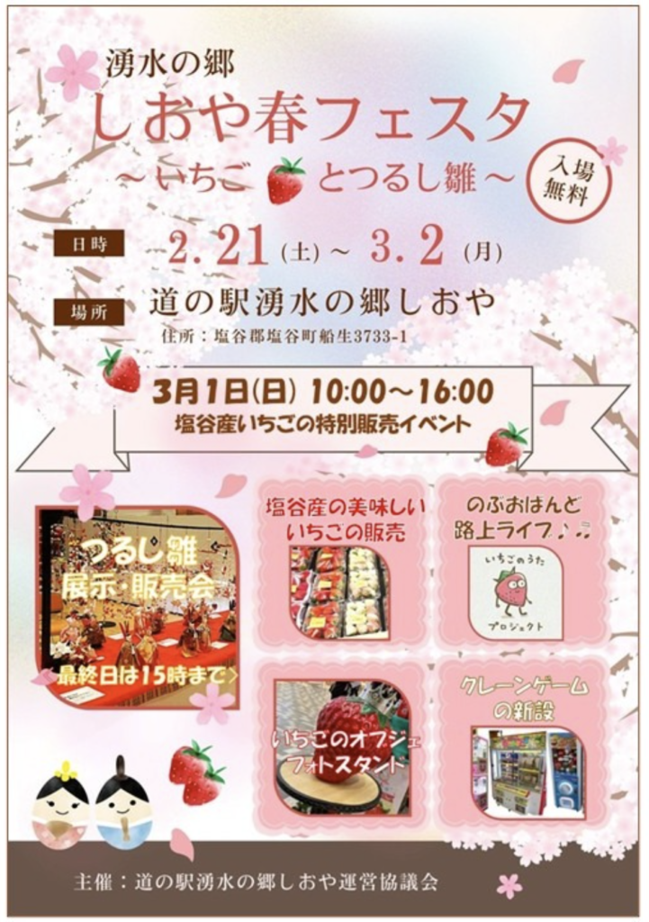 イベント情報 3/1(日)道の駅 湧水の郷しおやの「いちごDAY」にのぶおばんどが出演します Admin 2026年2月27日 3/1(日)道の駅 湧水の郷しおやの「いちごDAY」にのぶおばんどが出演します。 13:00から、のぶおばんどの路上ライブを開催、「いちごのうた」などを披露します。 観覧無料です。 応援よろしくお願いします!